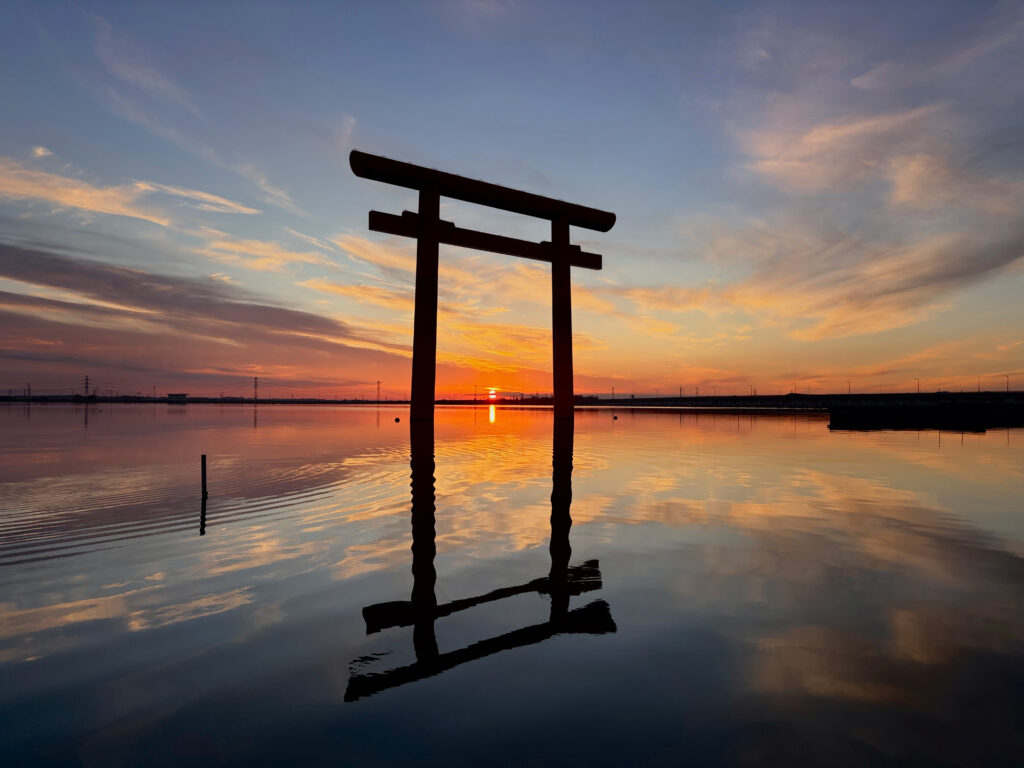 ぜひぜひ見てほしいのは、夕暮れどきのその風景。刻々と空が暗くなる中、真っ赤な夕日が水面を照らし、鳥居はきれいな茜色に染まり……。鳥居の向こうに夕日が沈む数十分の光景は本当に幻想的で、時を忘れて見惚れてしまいます。